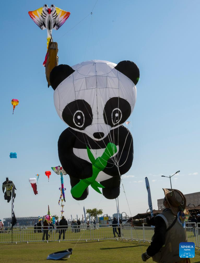 DOHA, 19 enero, 2025 (Xinhua) -- Un participante de China vuela una cometa con forma de panda gigante durante el Festival de Cometas de Qatar 2025 en el Viejo Puerto de Doha, en Doha, Qatar, el 19 de enero de 2025. (Xinhua/Nikku)