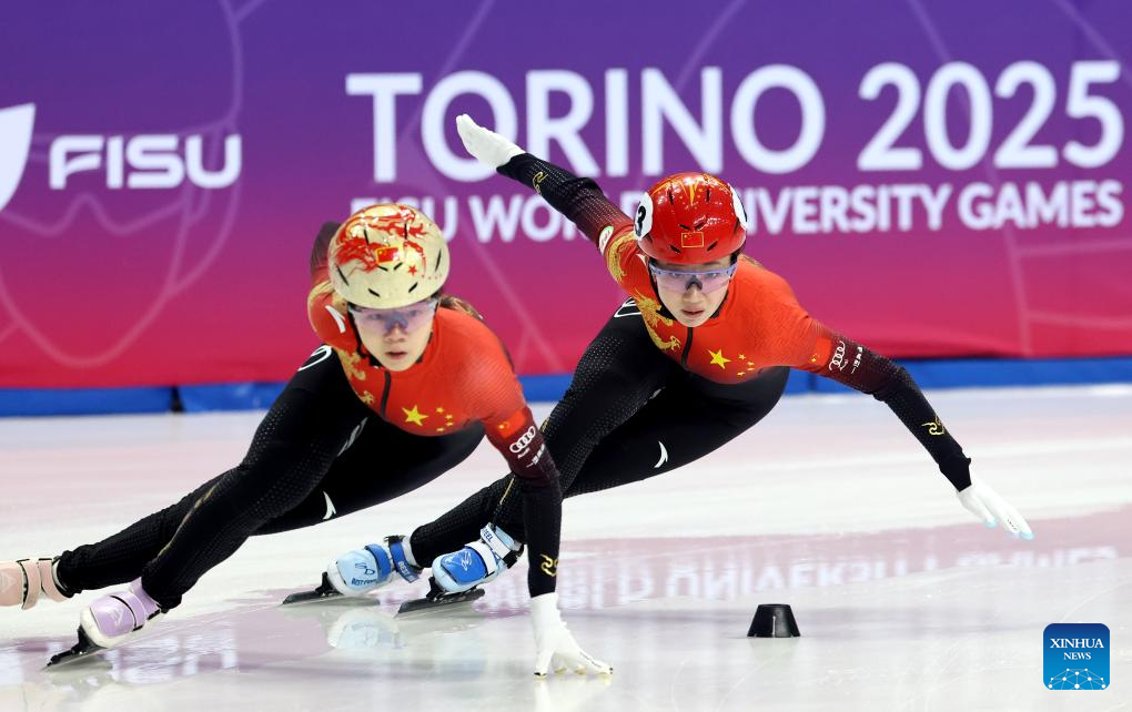 TURIN, 20 enero, 2025 (Xinhua) -- La patinadora de velocidad sobre pista corta, Song Yifei (d), de China, asiste a una sesión de entrenamiento previo a la competencia de patinaje de velocidad sobre pista corta en los Juegos Mundiales Universitarios de Invierno de la FISU Turín 2025, en Turín, Italia, el 20 de enero de 2025. (Xinhua/Zhang Chen)