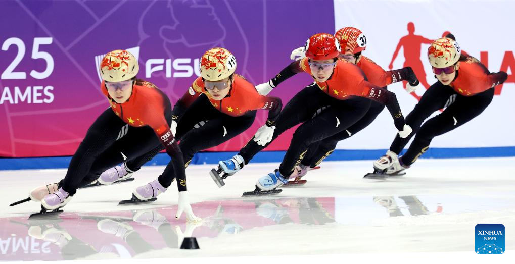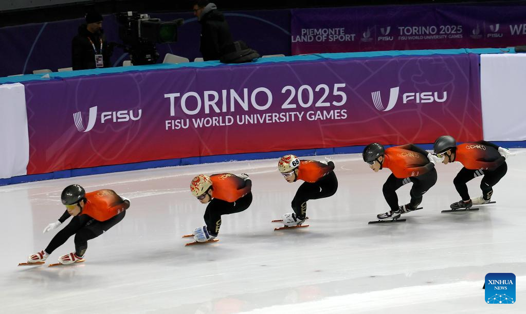 TURIN, 20 enero, 2025 (Xinhua) -- Patinadores de velocidad sobre pista corta de China asisten a una sesión de entrenamiento previo a la competencia de patinaje de velocidad sobre pista corta en los Juegos Mundiales Universitarios de Invierno de la FISU Turín 2025, en Turín, Italia, el 20 de enero de 2025. (Xinhua/Zhang Chen)