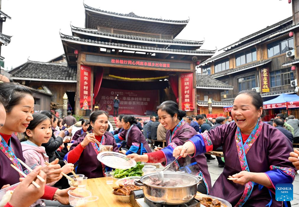 BEIJING, 22 enero, 2025 (Xinhua) -- Aldeanas locales disfrutan del banquete de Año Nuevo, en la aldea Pingyan del distrito autónomo dong de Sanjiang, en la región autónoma zhuang de Guangxi, en el sur de China, el 22 de enero de 2025. Como el Año Nuevo chino de 2025 caerá el 29 de enero, la emoción es palpable en todas partes en China. El pueblo chino se sumerge en las costumbres tradicionales y participa en las festividades. El Año Nuevo chino, o el Festival de Primavera, cae el próximo miércoles, marcando el comienzo del Año de la Serpiente. (Xinhua/Li Hanchi)