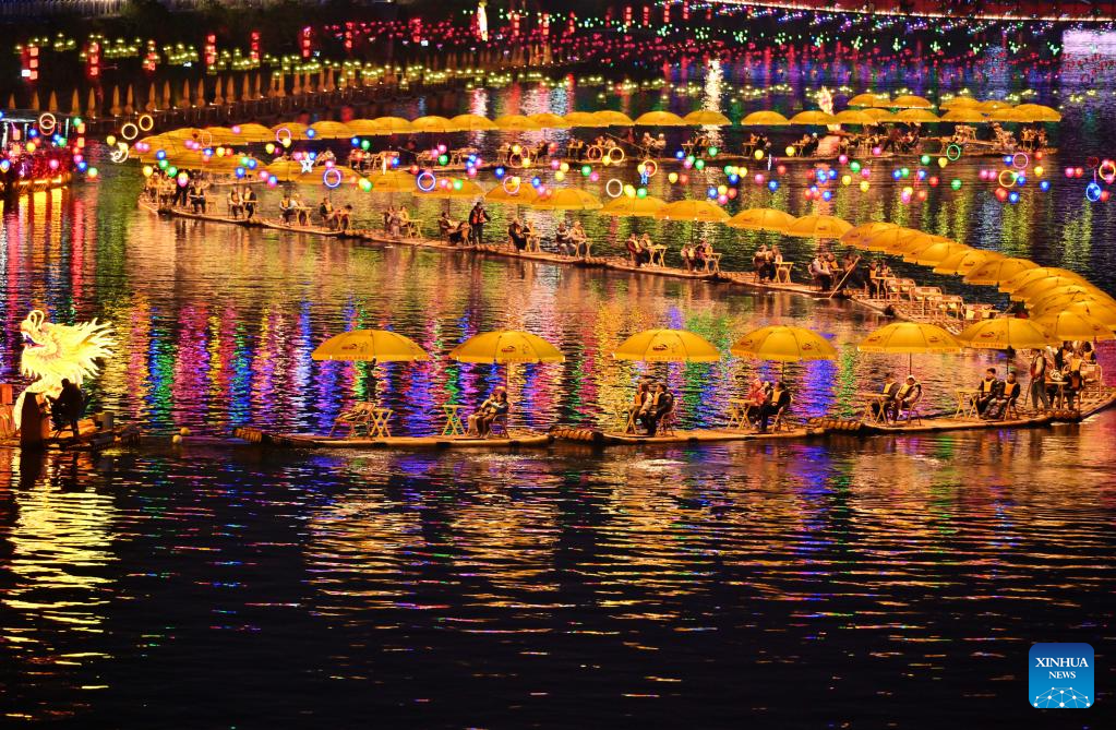 BEIJING, 22 enero, 2025 (Xinhua) -- Imagen del 21 de enero de 2025 de turistas disfrutando de la vista nocturna en balsas de bambú por el río Gongshui, en el distrito de Xuanen, en la provincia de Hubei, en el centro de China. Como el Año Nuevo chino de 2025 caerá el 29 de enero, la emoción es palpable en todas partes en China. El pueblo chino se sumerge en las costumbres tradicionales y participa en las festividades. El Año Nuevo chino, o el Festival de Primavera, cae el próximo miércoles, marcando el comienzo del Año de la Serpiente. (Xinhua/Song Wen)