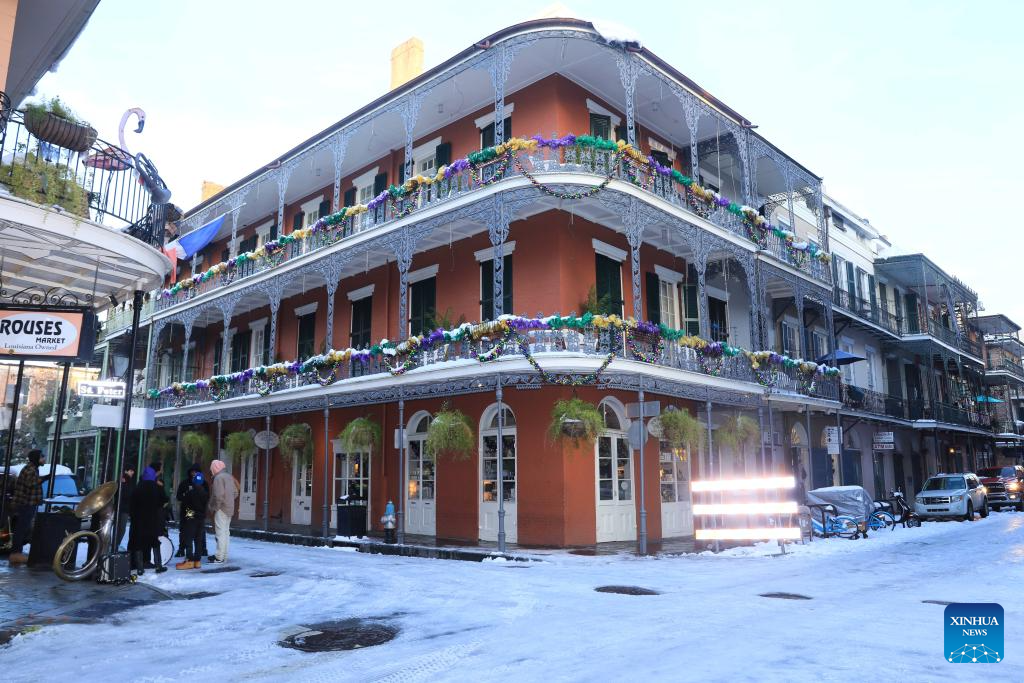 NUEVA ORLEANS, 23 enero, 2025 (Xinhua) -- Imagen del 22 de enero de 2025 de una calle cubierta de nieve, en Nueva Orleans, Luisiana, Estados Unidos. Una rara tormenta invernal, conocida como Enzo, ha barrido el sur de Estados Unidos con nevadas récord y clima extremadamente frío en regiones típicamente templadas de la costa del Golfo, cobrándose al menos nueve vidas hasta el miércoles por la mañana. Nueva Orleans, la ciudad más grande del estado costero de Luisiana, experimentó el martes su nevada más intensa desde 1948, con 8 pulgadas caídas en un solo día, superando por mucho el récord anterior de 2,7 pulgadas, de acuerdo con un informe de weather.com del miércoles. (Xinhua/Lan Wei)