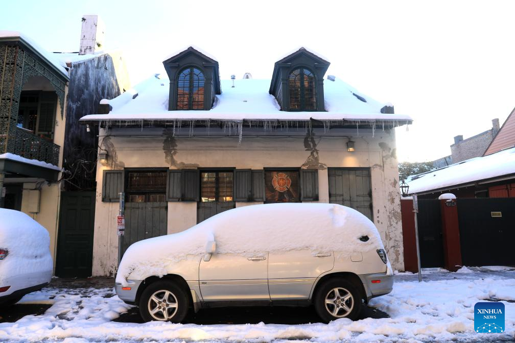NUEVA ORLEANS, 23 enero, 2025 (Xinhua) -- Imagen del 22 de enero de 2025 de una casa cubierta de nieve, en Nueva Orleans, Luisiana, Estados Unidos. Una rara tormenta invernal, conocida como Enzo, ha barrido el sur de Estados Unidos con nevadas récord y clima extremadamente frío en regiones típicamente templadas de la costa del Golfo, cobrándose al menos nueve vidas hasta el miércoles por la mañana. Nueva Orleans, la ciudad más grande del estado costero de Luisiana, experimentó el martes su nevada más intensa desde 1948, con 8 pulgadas caídas en un solo día, superando por mucho el récord anterior de 2,7 pulgadas, de acuerdo con un informe de weather.com del miércoles. (Xinhua/Lan Wei)