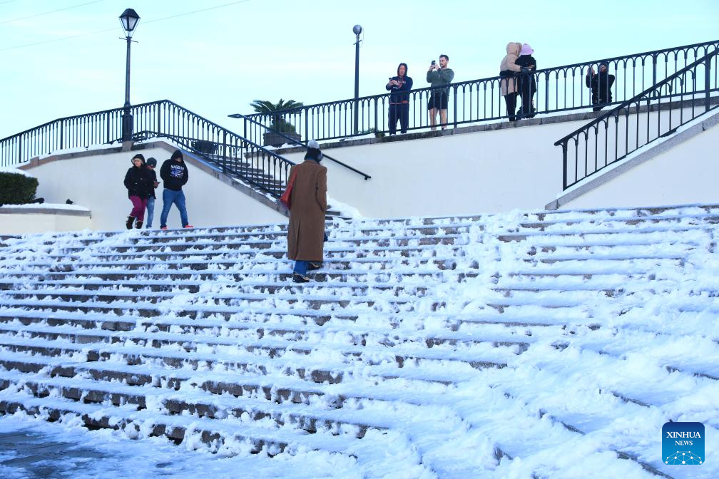 NUEVA ORLEANS, 23 enero, 2025 (Xinhua) -- Imagen del 22 de enero de 2025 de personas caminando en escalones cubiertos de nieve, en Nueva Orleans, Luisiana, Estados Unidos. Una rara tormenta invernal, conocida como Enzo, ha barrido el sur de Estados Unidos con nevadas récord y clima extremadamente frío en regiones típicamente templadas de la costa del Golfo, cobrándose al menos nueve vidas hasta el miércoles por la mañana. Nueva Orleans, la ciudad más grande del estado costero de Luisiana, experimentó el martes su nevada más intensa desde 1948, con 8 pulgadas caídas en un solo día, superando por mucho el récord anterior de 2,7 pulgadas, de acuerdo con un informe de weather.com del miércoles. (Xinhua/Lan Wei)