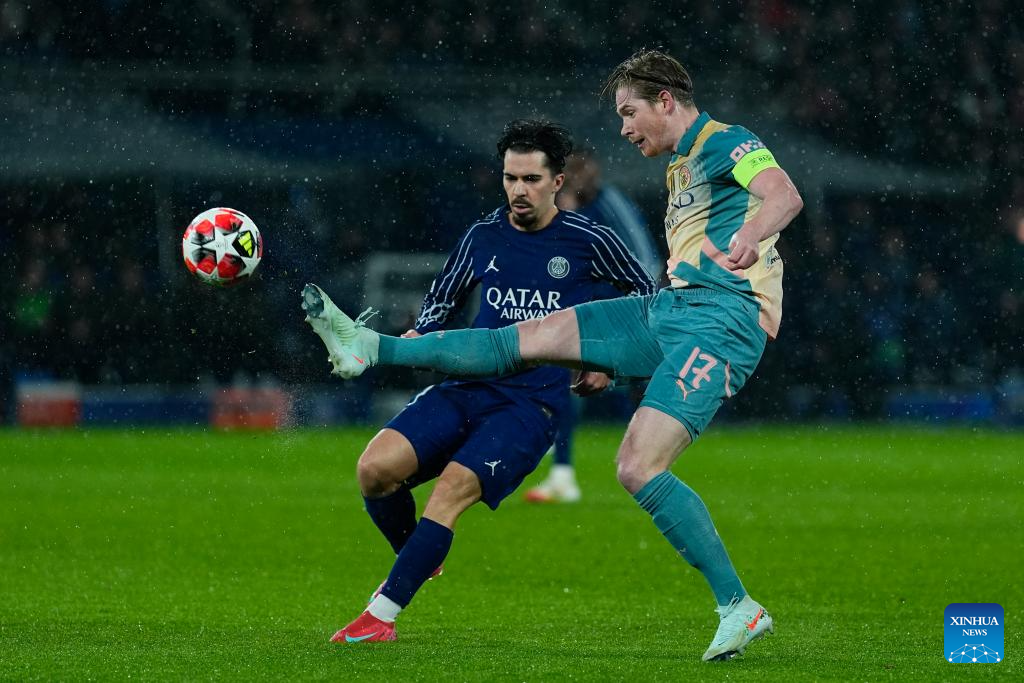 PARIS, 23 enero, 2025 (Xinhua) -- Imagen del 22 de enero de 2025 de Vitinha (i), de Paris Saint-Germain, disputando el balón con Kevin De Bruyne, de Manchester City, durante el partido de fútbol de la Liga de Campeones de la UEFA entre Paris Saint-Germain y Manchester City, en París, Francia. (Xinhua/Glenn Gervot)