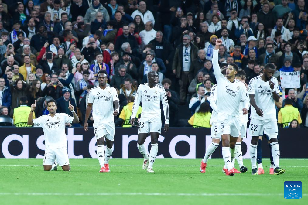 MADRID, 23 enero, 2025 (Xinhua) -- Imagen del 22 de enero de 2025 de jugadores de Real Madrid festejando una anotación durante el partido de fútbol de la Liga de Campeones entre Real Madrid y Salzburg, en Madrid, España. (Xinhua/Gustavo Valiente)