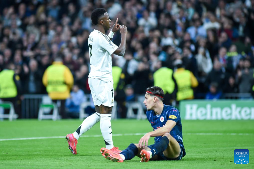 MADRID, 23 enero, 2025 (Xinhua) -- Imagen del 22 de enero de 2025 de Vinicius Junior (i), de Real Madrid, festejando una anotación durante el partido de fútbol de la Liga de Campeones entre Real Madrid y Salzburg, en Madrid, España. (Xinhua/Gustavo Valiente)