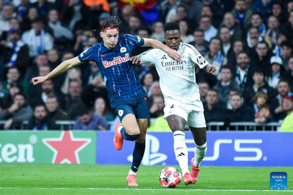 MADRID, 23 enero, 2025 (Xinhua) -- Imagen del 22 de enero de 2025 de Vinicius Junior (d), de Real Madrid, disputando el balón con Amar Dedic, de Salzburg, durante el partido de fútbol de la Liga de Campeones entre Real Madrid y Salzburg, en Madrid, España. (Xinhua/Gustavo Valiente)