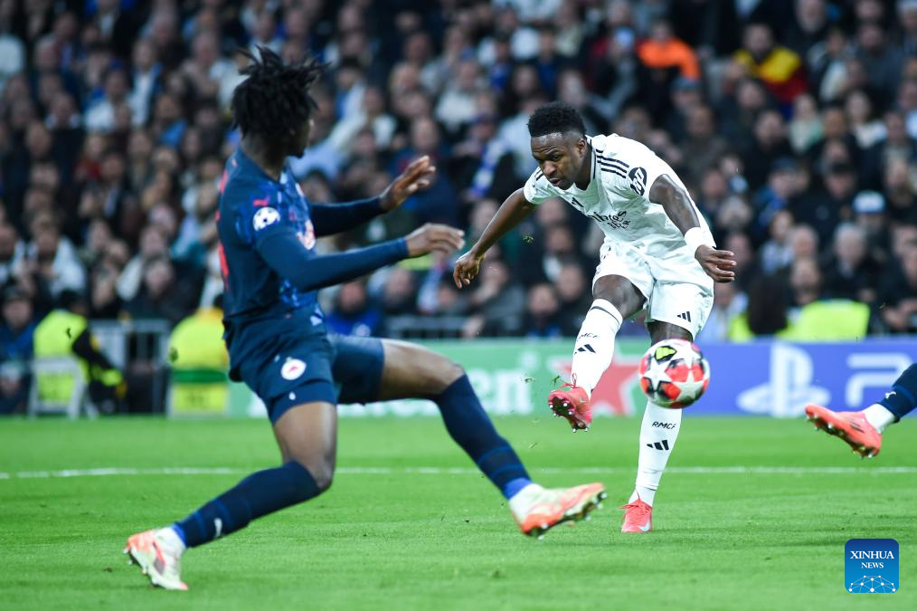 MADRID, 23 enero, 2025 (Xinhua) -- Imagen del 22 de enero de 2025 de Vinicius Junior (d), de Real Madrid, disparando el balón durante el partido de fútbol de la Liga de Campeones entre Real Madrid y Salzburg, en Madrid, España. (Xinhua/Gustavo Valiente)