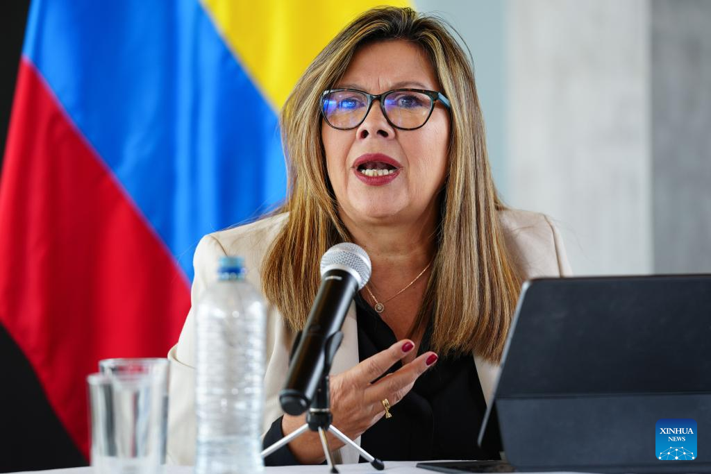 La fiscal colombiana, Luz Adriana Camargo, habla durante la rueda de prensa sobre la situación y las acciones institucionales en la región del Catatumbo, llevada a cabo en las instalaciones de la Fiscalía General de la Nación, en la ciudad de Bogotá, Colombia, el 23 de enero 2025. La crisis humanitaria y violencia que se vive en la región colombiana de Catatumbo (noreste), la cual ha dejado decenas de muertos y miles de desplazados y campesinos confinados, se está extendiendo a otras regiones del país como Guaviare (sur), alertó el jueves Camargo. (Xinhua/Andrés Moreno)
