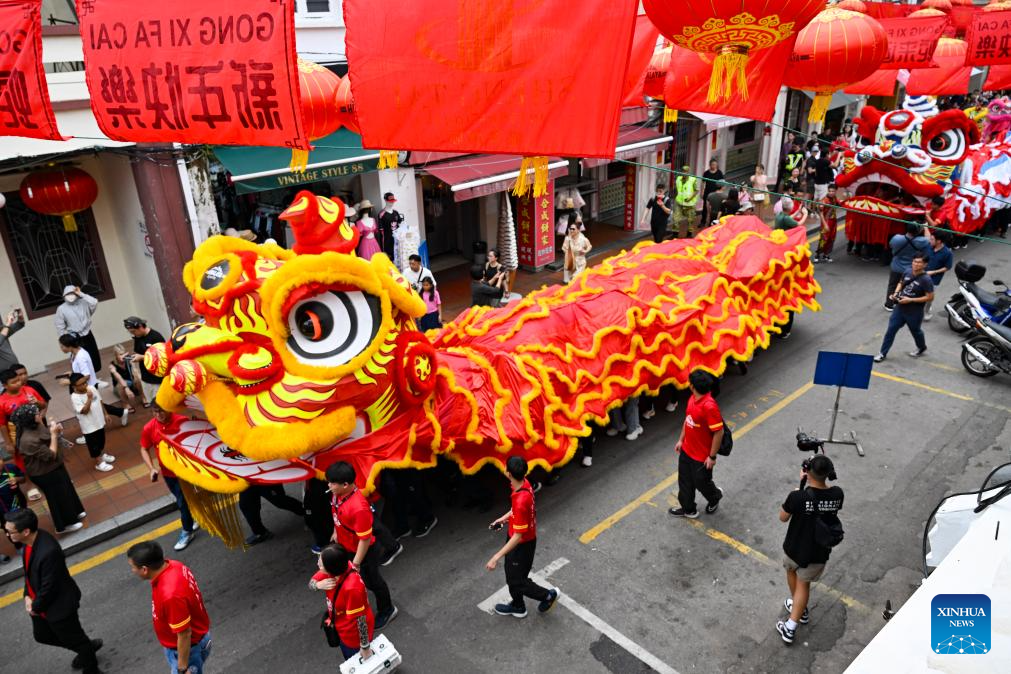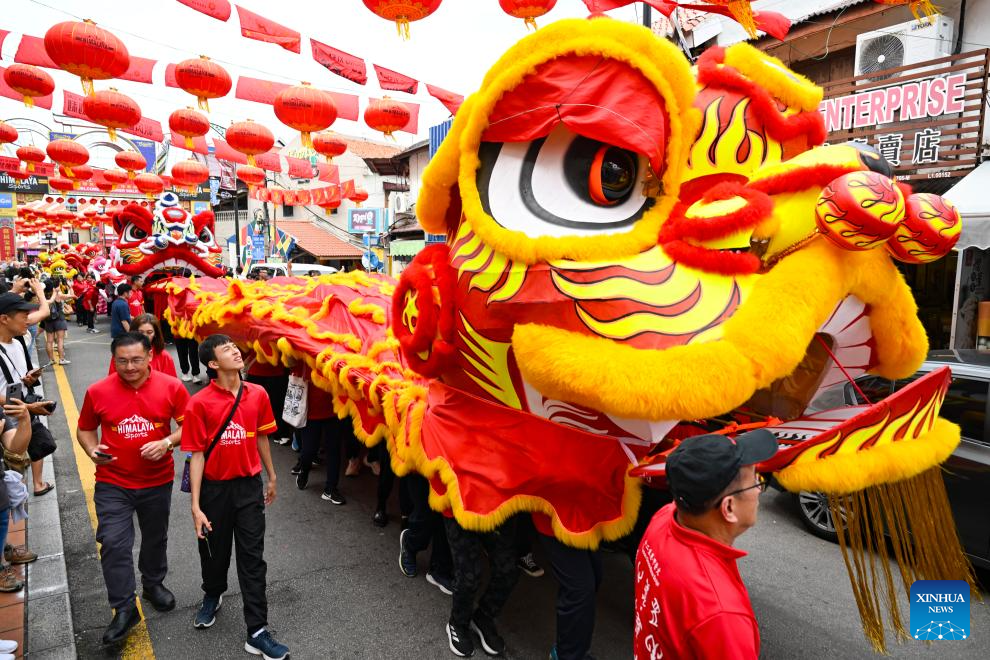 MALACA, 23 enero, 2025 (Xinhua) -- Imagen del 21 de enero de 2025 de personas realizando la danza del león en la calle Jonker, en Malaca, Malasia. Cerca de 100 personas realizaron la danza del león aquí el martes para celebrar el próximo Festival de Primavera. (Xinhu/Chong Voon Chung)
