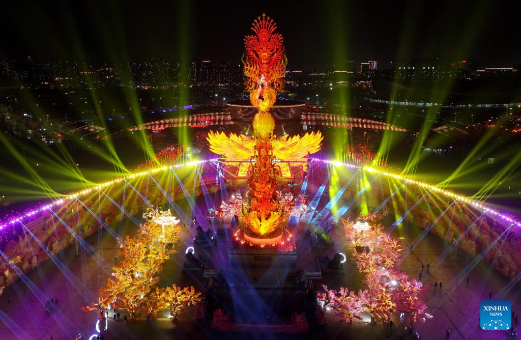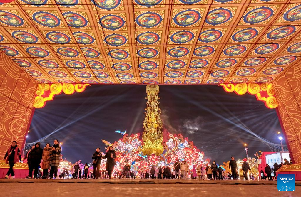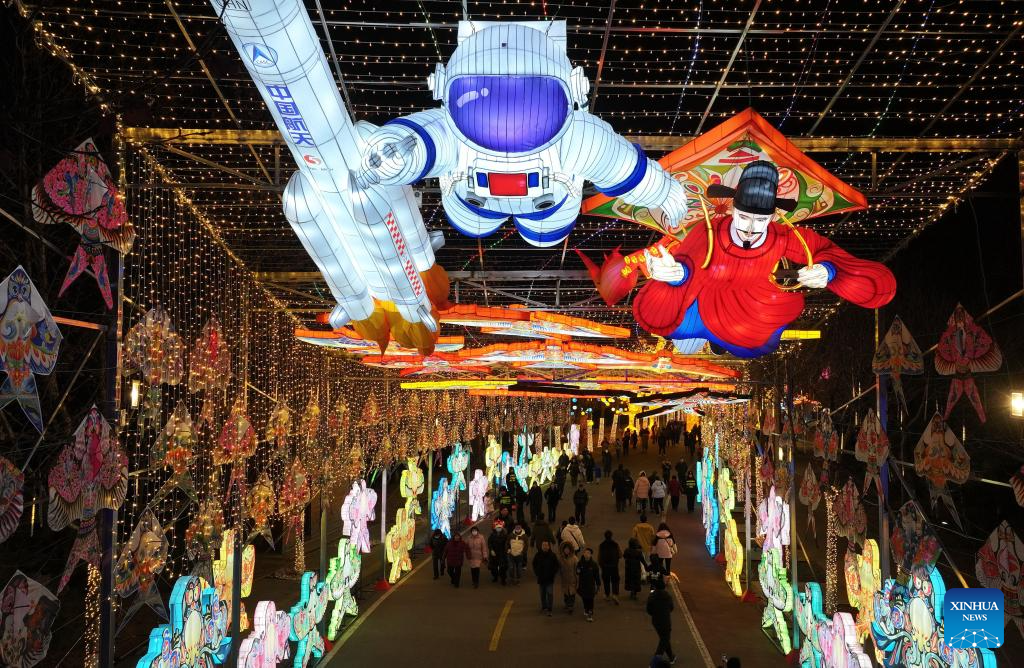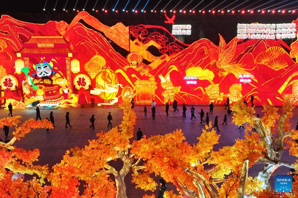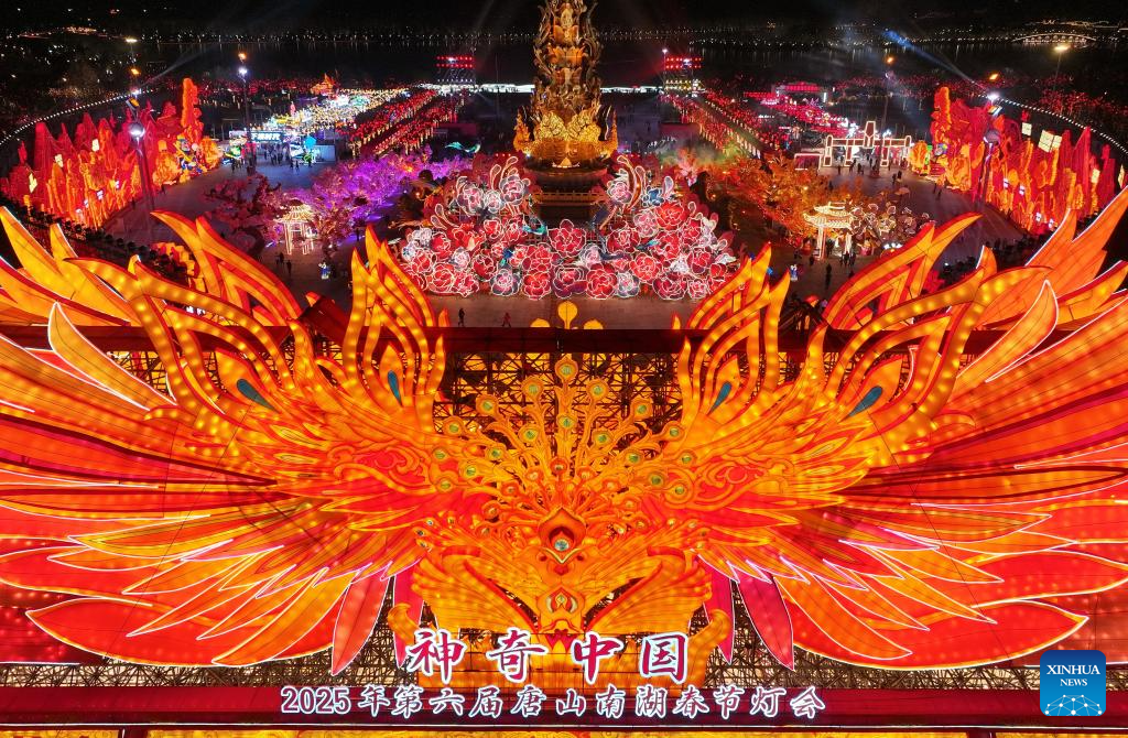 TANGSHAN, 23 enero, 2025 (Xinhua) -- Vista aérea tomada con un dron el 22 de enero de 2025 de personas visitando la feria de linternas del Festival de Primavera de Nanhu de Tangshan, en Tangshan, en la provincia de Hebei, en el norte de China. La feria de linternas del Festival de Primavera de Nanhu de Tangshan 2025 se inauguró aquí el miércoles, la cual durará hasta el 1 de marzo. (Xinhua/Yang Shiyao)