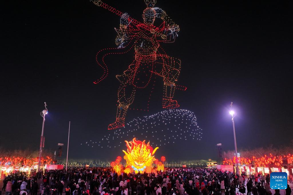 TANGSHAN, 23 enero, 2025 (Xinhua) -- Vista aérea tomada con un dron el 22 de enero de 2025 de personas observando una presentación de drones durante la feria de linternas del Festival de Primavera de Nanhu de Tangshan, en Tangshan, en la provincia de Hebei, en el norte de China. La feria de linternas del Festival de Primavera de Nanhu de Tangshan 2025 se inauguró aquí el miércoles, la cual durará hasta el 1 de marzo. (Xinhua/Yang Shiyao)