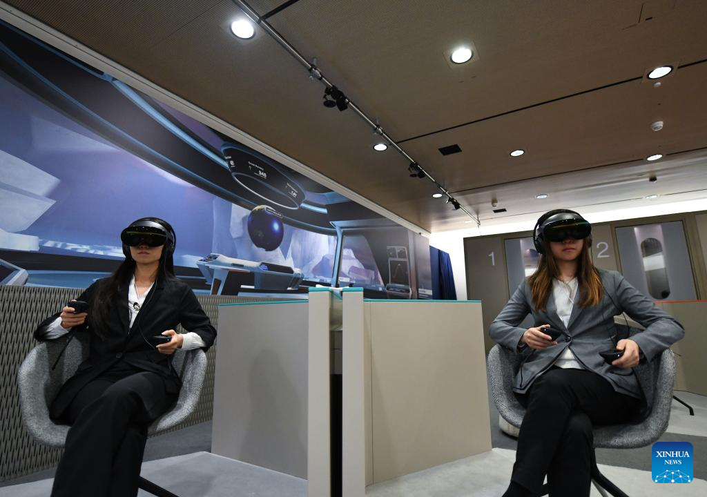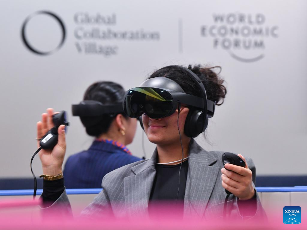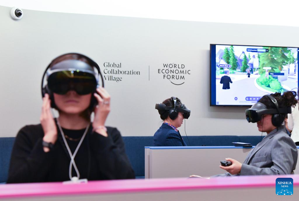 DAVOS, 24 enero, 2025 (Xinhua) -- Imagen del 23 de enero de 2025 de personas que usan cascos de realidad virtual asistiendo al Foro Económico Mundial (FEM) de "manera inmersiva", en Davos, Suiza. Bajo el lema "Colaboración para la Era Inteligente", la Reunión Anual 2025 del FEM 2025 ha reunido a cerca de 3.000 participantes de diversas regiones e industrias. (Xinhua/Lian Yi)