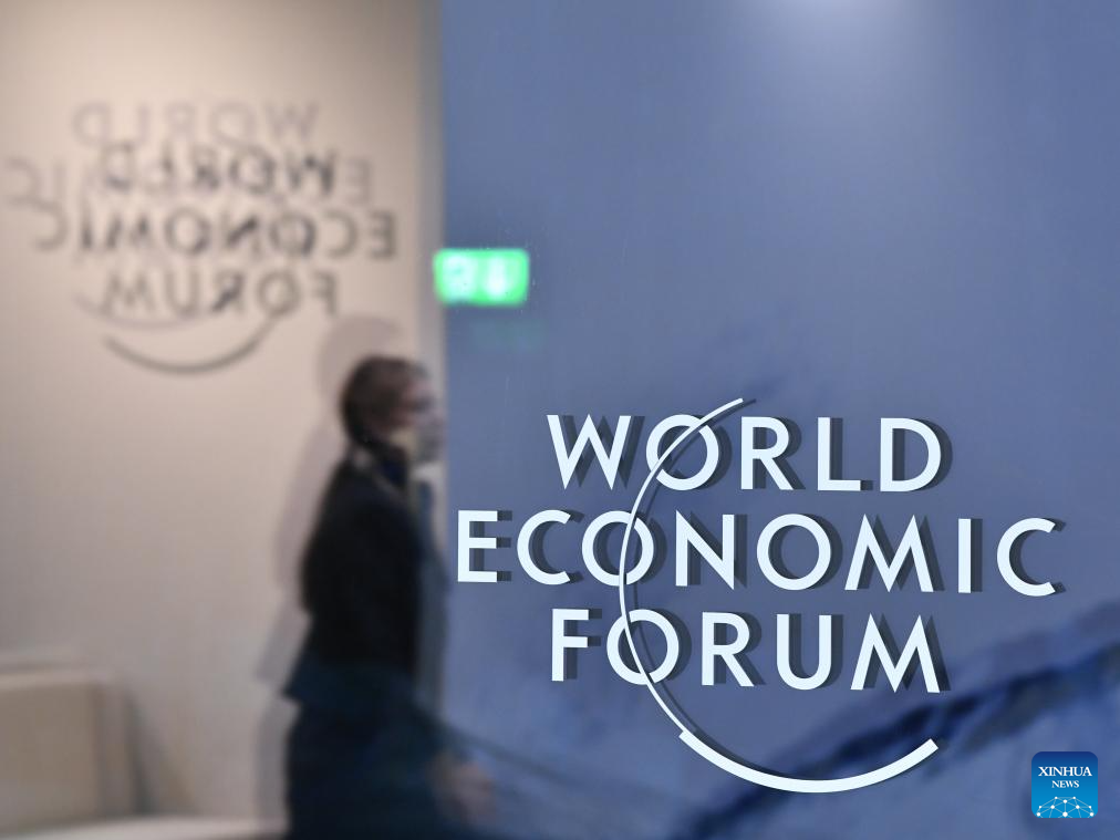 DAVOS, 24 enero, 2025 (Xinhua) -- Imagen del 23 de enero de 2025 de una mujer caminando junto al logotipo del Foro Económico Mundial (FEM), en Davos, Suiza. Bajo el lema "Colaboración para la Era Inteligente", la Reunión Anual 2025 del FEM 2025 ha reunido a cerca de 3.000 participantes de diversas regiones e industrias. (Xinhua/Lian Yi)