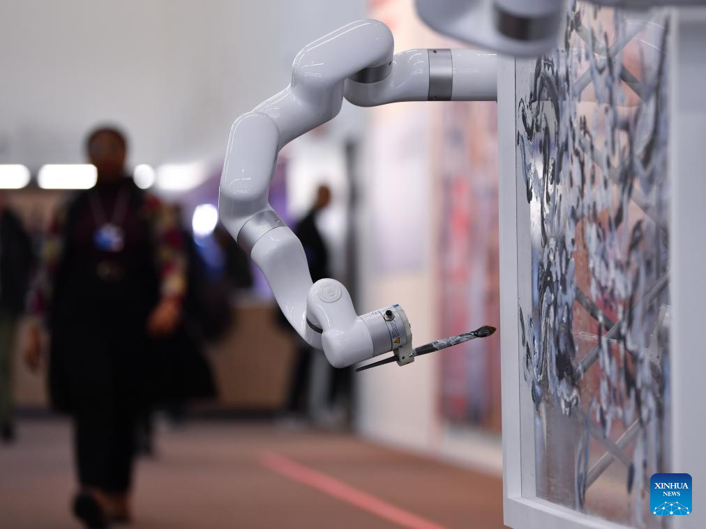 DAVOS, 24 enero, 2025 (Xinhua) -- Imagen del 23 de enero de 2025 de un brazo robótico de pintura visto en el Centro de Congresos para la Reunión Anual del Foro Económico Mundial (FEM), en Davos, Suiza. Bajo el lema "Colaboración para la Era Inteligente", la Reunión Anual 2025 del FEM 2025 ha reunido a cerca de 3.000 participantes de diversas regiones e industrias. (Xinhua/Lian Yi)