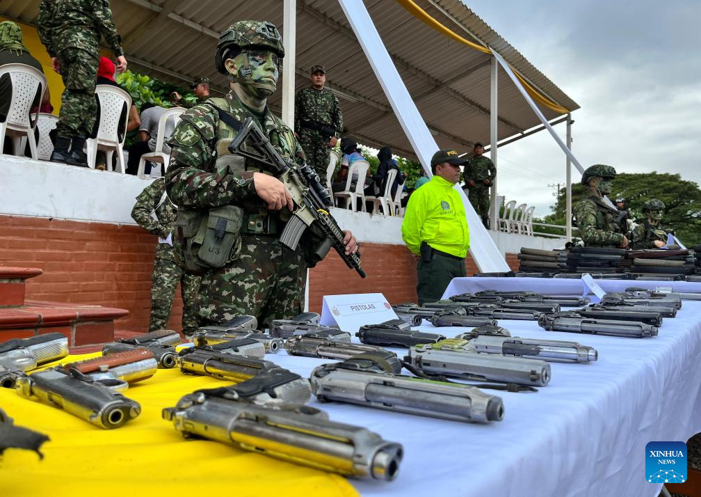CATATUMBO, 25 enero, 2025 (Xinhua) -- Imagen proveída por COLPRENSA de militares custodiando las armas incautadas durante un evento de presentación de la primera incautación de material de guerra luego de que iniciaran las operaciones ofensivas por parte de las Fuerzas Militares en la región del Catatumbo para intentar recuperar la zona y acabar con la crisis humanitaria, en Catatumbo, Norte de Santander, Colombia, el 25 de enero de 2025. El Gobierno de Colombia emitió el viernes un decreto que declara el estado de conmoción interior en varios municipios del noreste del país, en respuesta a la crisis en la región del Catatumbo provocada por la ofensiva de la guerrilla del Ejército de Liberación Nacional (ELN), que deja al menos 80 muertos y más de 40.000 desplazados en la última semana. (Xinhua/COLPRENSA)