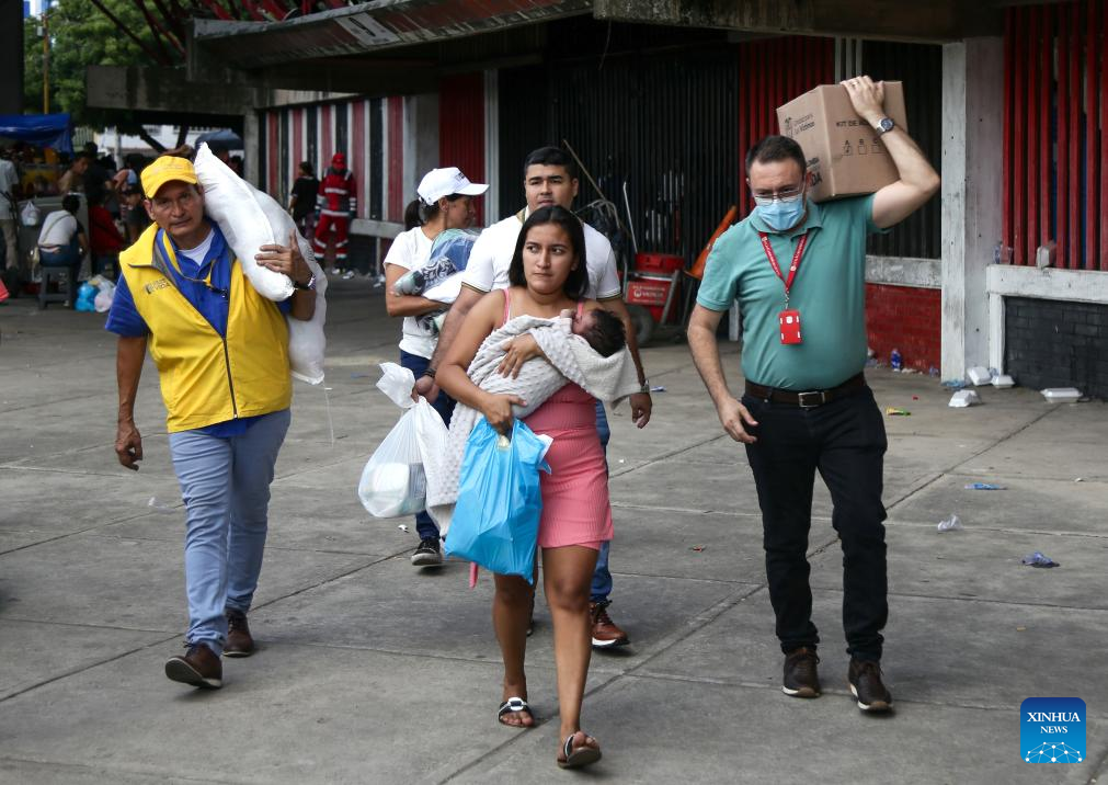 CÚCUTA, 25 enero, 2025 (Xinhua) -- Imagen proveída por COLPRENSA del 24 de enero de 2025 de personas desplazadas recibiendo asistencia y donaciones en el Estadio General Santander, donde están llegando personas desplazadas de la región del Catatumbo debido a la violencia, en Cúcuta, Colombia. El Gobierno de Colombia emitió el viernes un decreto que declara el estado de conmoción interior en varios municipios del noreste del país, en respuesta a la crisis en la región del Catatumbo provocada por la ofensiva de la guerrilla del Ejército de Liberación Nacional (ELN), que deja al menos 80 muertos y más de 40.000 desplazados en la última semana. (Xinhua/Catalina Olaya/COLPRENSA)