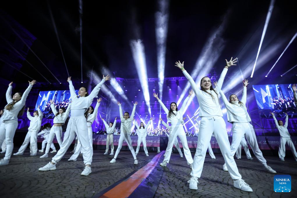 TURIN, 24 enero, 2025 (Xinhua) -- Imagen del 23 de enero de 2025 de artistas presentándose durante la ceremonia de clausura de los Juegos Mundiales Universitarios de Invierno de la FISU Turín 2025, en Turín, Italia. (Xinhua/Zhang Fan)