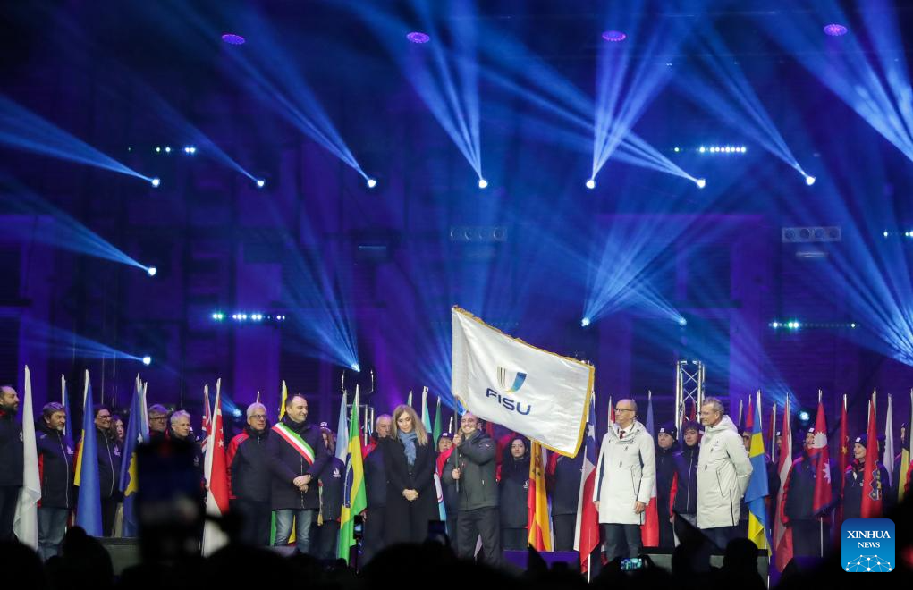 TURIN, 24 enero, 2025 (Xinhua) -- Imagen del 23 de enero de 2025 de Alessandro Ciro Sciretti (c), presidente del comité organizador de Turín 2025, ondeando la bandera de la FISU durante la ceremonia de clausura de los Juegos Mundiales Universitarios de Invierno de la FISU Turín 2025, en Turín, Italia. (Xinhua/Zhang Fan)