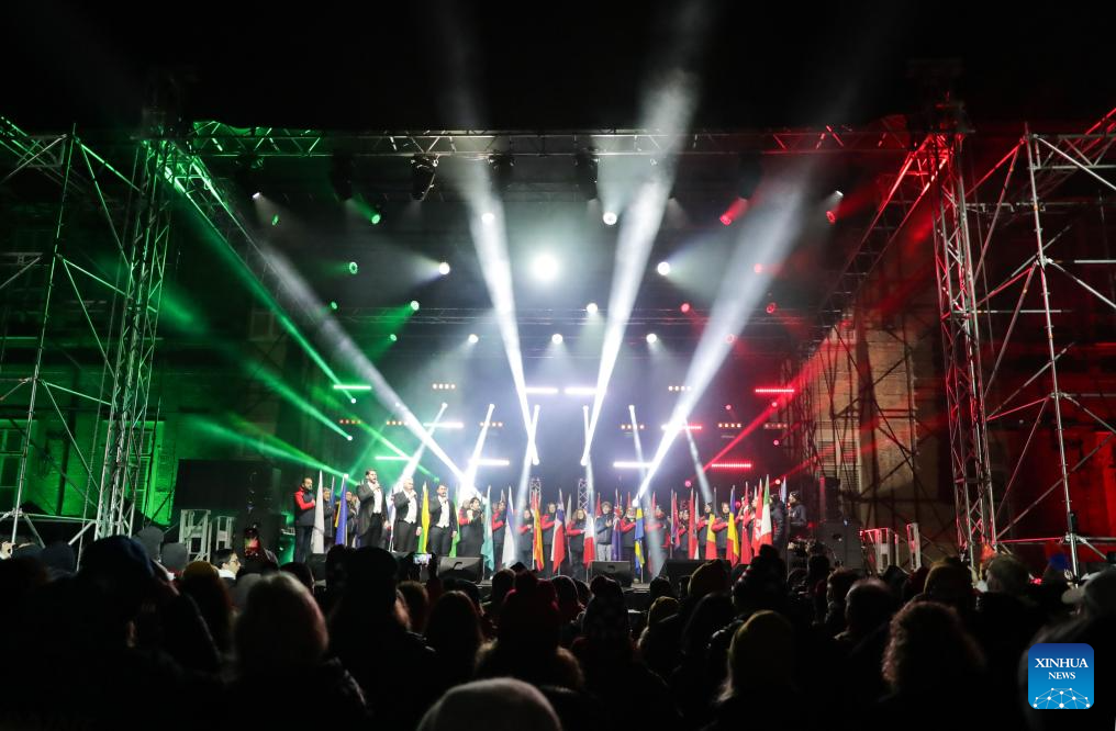 TURIN, 24 enero, 2025 (Xinhua) -- Imagen del 23 de enero de 2025 de artistas presentándose durante la ceremonia de clausura de los Juegos Mundiales Universitarios de Invierno de la FISU Turín 2025, en Turín, Italia. (Xinhua/Li Jing)