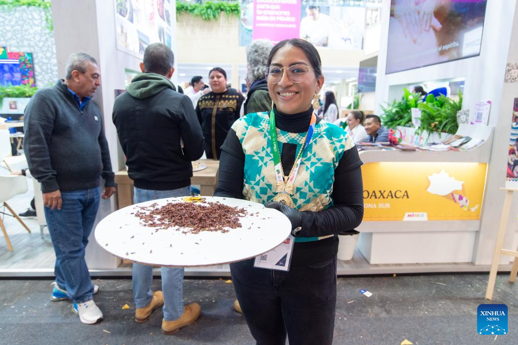 MADRID, 25 enero, 2025 (Xinhua) -- Imagen del 24 de enero de 2025 de una trabajadora ofreciendo a los visitantes un bocadillo tradicional mexicano en el en el área de exposición de México durante la Feria Internacional de Turismo (FITUR) 2025, en Madrid, España. La FITUR 2025 se inauguró el miércoles en Madrid, mostrando una sólida recuperación en el sector turístico global. China tiene una fuerte presencia en la FITUR, con empresas como Enjoy China, Fantastica China, la Oficina de Turismo de China en España y Focus China mostrando sus ofertas en los próximos días. (Xinhua/Gustavo Valiente)