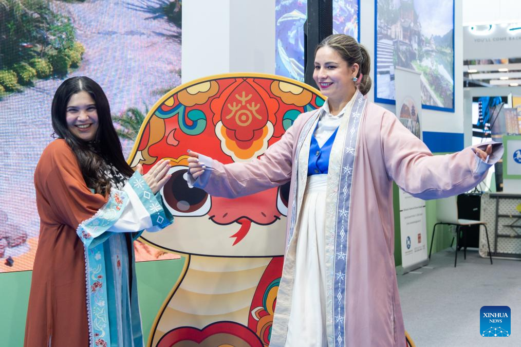 MADRID, 25 enero, 2025 (Xinhua) -- Imagen del 24 de enero de 2025 de visitantes con atuendos tradicionales Hanfu posando para fotografías en el área de exposición de China durante la Feria Internacional de Turismo (FITUR) 2025, en Madrid, España. La FITUR 2025 se inauguró el miércoles en Madrid, mostrando una sólida recuperación en el sector turístico global. China tiene una fuerte presencia en la FITUR, con empresas como Enjoy China, Fantastica China, la Oficina de Turismo de China en España y Focus China mostrando sus ofertas en los próximos días. (Xinhua/Gustavo Valiente)