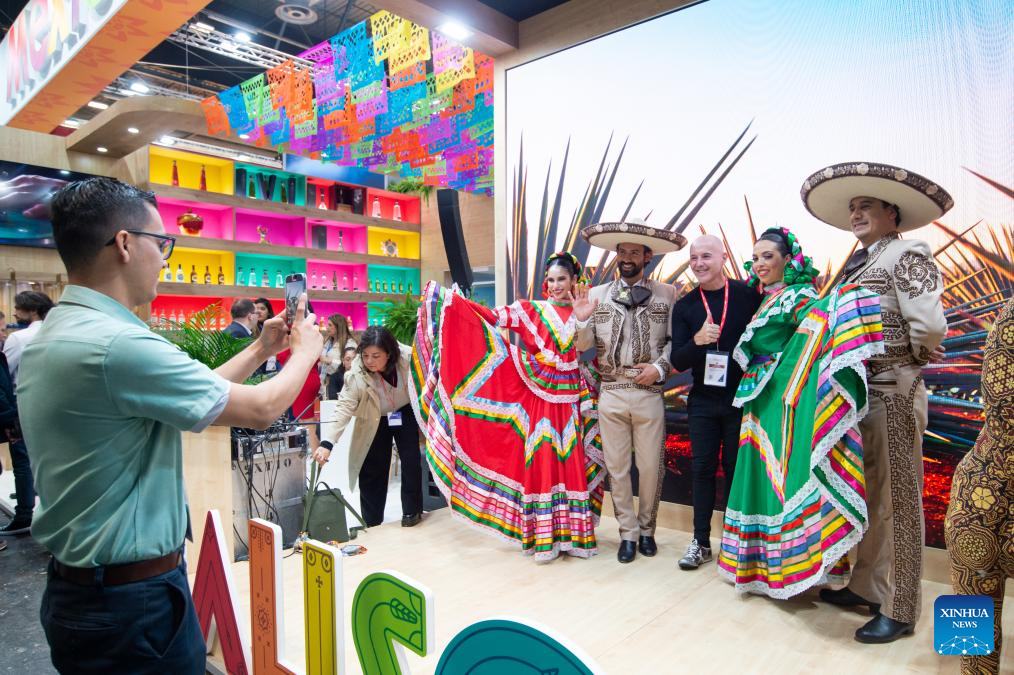 MADRID, 25 enero, 2025 (Xinhua) -- Imagen del 24 de enero de 2025 de un trabajador posando para fotografías con artistas en el área de exposición de México durante la Feria Internacional de Turismo (FITUR) 2025, en Madrid, España. La FITUR 2025 se inauguró el miércoles en Madrid, mostrando una sólida recuperación en el sector turístico global. China tiene una fuerte presencia en la FITUR, con empresas como Enjoy China, Fantastica China, la Oficina de Turismo de China en España y Focus China mostrando sus ofertas en los próximos días. (Xinhua/Gustavo Valiente)