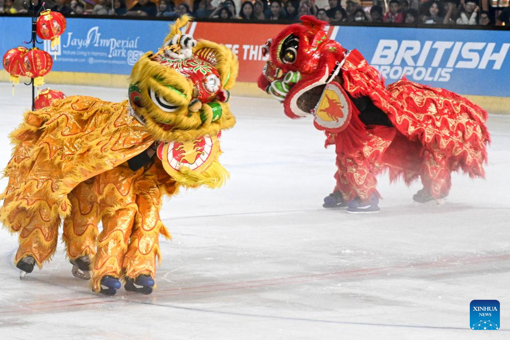 TANGERANG DEL SUR, 25 enero, 2025 (Xinhua) -- Bailarines del león realizan una presentación sobre hielo para celebrar el próximo Año Nuevo Lunar chino, o la Fiesta de la Primavera, en el Centro Comercial Bintaro Exchange, en Tangerang del Sur, en la provincia de Banten, Indonesia, el 25 de enero de 2025. (Xinhua/Agung Kuncahya B.)