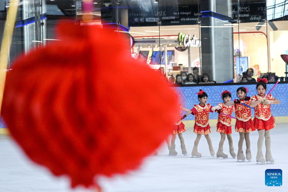 TANGERANG DEL SUR, 25 enero, 2025 (Xinhua) -- Niños participan en una presentación sobre hielo para celebrar el próximo Año Nuevo Lunar chino, o la Fiesta de la Primavera, en el Centro Comercial Bintaro Exchange, en Tangerang del Sur, en la provincia de Banten, Indonesia, el 25 de enero de 2025. (Xinhua/Agung Kuncahya B.)