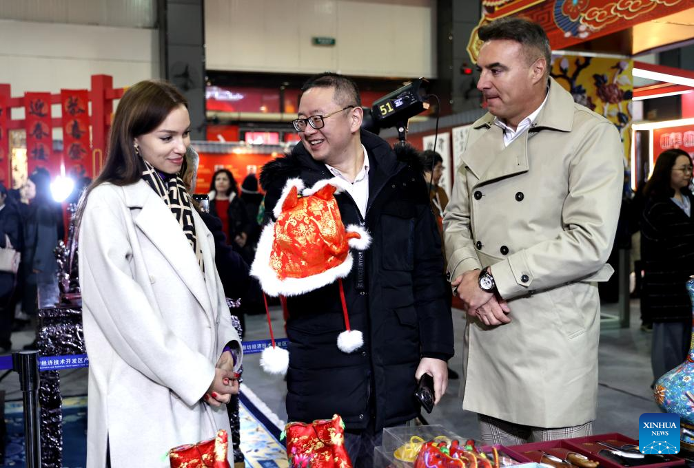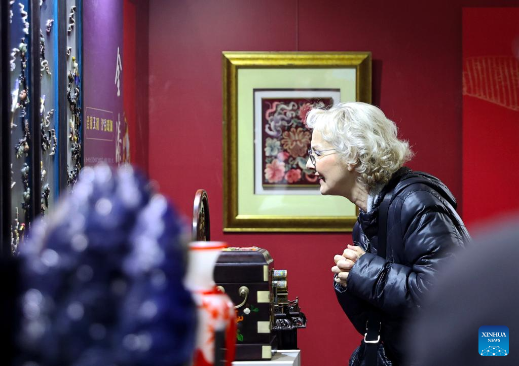 SHIJIAZHUANG, 25 enero, 2025 (Xinhua) -- Imagen del 23 de enero de 2025 de una diplomática observando obras de arte en un evento festivo por el próximo Año Nuevo chino, o la Fiesta de la Primavera, en Langfang, en la provincia de Hebei, en el norte de China. (Xinhua/Wang Xiao)