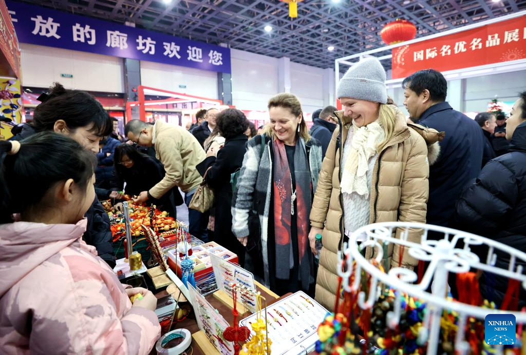 SHIJIAZHUANG, 25 enero, 2025 (Xinhua) -- Imagen del 23 de enero de 2025 de miembros del cuerpo diplomático seleccionando productos en un evento festivo por el próximo Año Nuevo chino, o la Fiesta de la Primavera, en Langfang, en la provincia de Hebei, en el norte de China. (Xinhua/Wang Xiao)