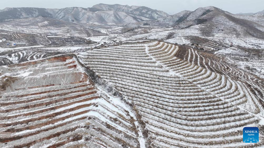 BEIJING, 26 enero, 2025 (Xinhua) -- Vista aérea tomada con un dron del paisaje nevado de los campos aterrazados, en el municipio de Liubeizhai de Zunhua, en la provincia de Hebei, en el norte de China, el 26 de enero de 2025. (Xinhua/Liu Mancang)
