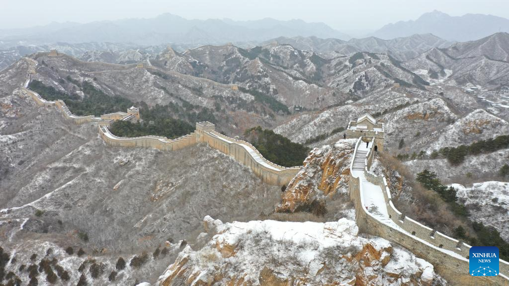 BEIJING, 26 enero, 2025 (Xinhua) -- Vista aérea tomada con un dron del paisaje nevado de la sección de Jinshanling de la Gran Muralla, en el distrito de Luanping, en la provincia de Hebei, en el norte de China, el 26 de enero de 2025. (Xinhua/Zhou Wanping)