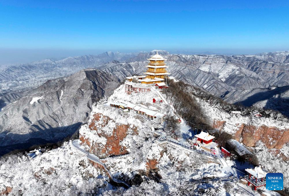 BEIJING, 26 enero, 2025 (Xinhua) -- Vista aérea tomada con un dron del paisaje nevado del punto escénico de la Montaña Wangwu, en la ciudad de Jiyuan, en la provincia de Henan, en el centro de China, el 26 de enero de 2025. (Xinhua/Duan Erping)