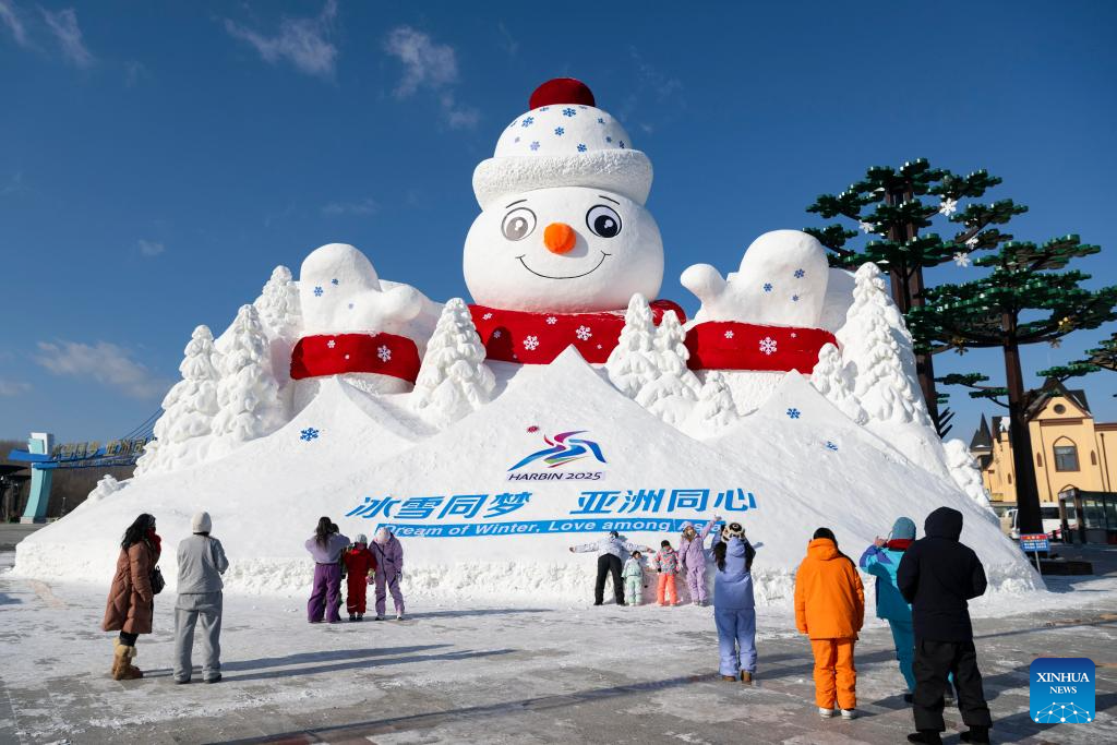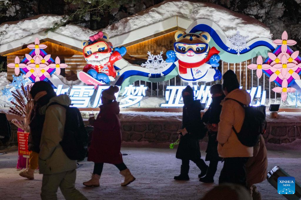 HARBIN, 26 enero, 2025 (Xinhua) -- Imagen del 24 de enero de 2025 de visitantes caminando frente a instalaciones temáticas sobre los Juegos Asiáticos de Invierno 2025 en el punto escénico "Poblado de Nieve", en Mudanjiang, en la provincia de Heilongjiang, en el noreste de China. Como parte de la autopista nacional G333, la Carretera Yaxue conecta Harbin, Yabuli y el "Poblado de Nieve", todos ellos atracciones turísticas invernales icónicas en el noreste de China, ofreciendo a los visitantes el encanto natural y cultural de la región. (Xinhua/Xie Jianfei)