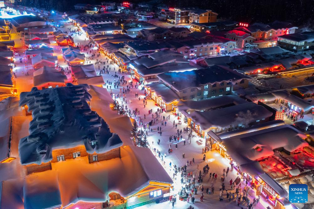 HARBIN, 26 enero, 2025 (Xinhua) -- Imagen tomada con un dron el 24 de enero de 2025 de una vista nocturna en el punto escénico "Poblado de Nieve" de China, a lo largo de la Carretera Yaxue, en Mudanjiang, en la provincia de Heilongjiang, en el noreste de China. Como parte de la autopista nacional G333, la Carretera Yaxue conecta Harbin, Yabuli y el "Poblado de Nieve", todos ellos atracciones turísticas invernales icónicas en el noreste de China, ofreciendo a los visitantes el encanto natural y cultural de la región. (Xinhua/Xie Jianfei)