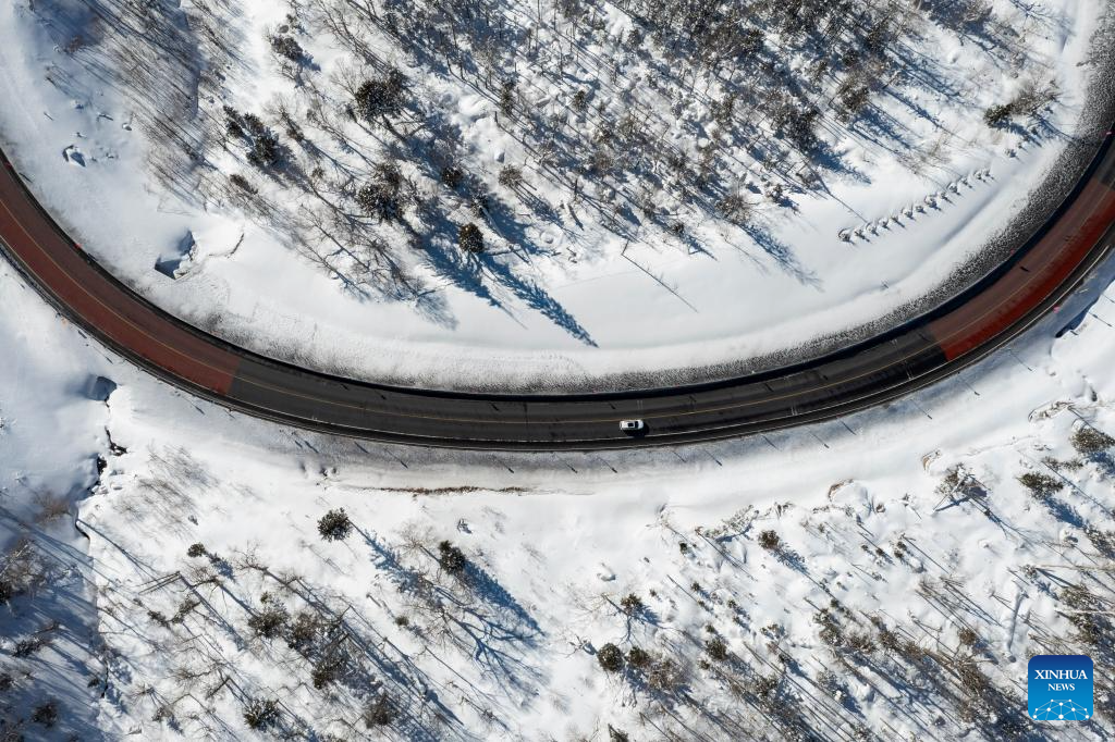 HARBIN, 26 enero, 2025 (Xinhua) -- Imagen tomada con un dron el 25 de enero de 2025 de un vehículo circulando en la Carretera Yaxue, en la provincia de Heilongjiang, en el noreste de China. Como parte de la autopista nacional G333, la Carretera Yaxue conecta Harbin, Yabuli y el "Poblado de Nieve", todos ellos atracciones turísticas invernales icónicas en el noreste de China, ofreciendo a los visitantes el encanto natural y cultural de la región. (Xinhua/Xie Jianfei)