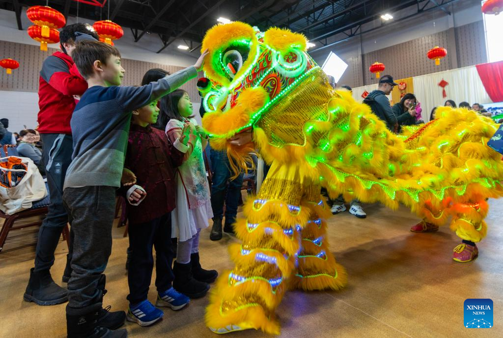 TORONTO, 27 enero, 2025 (Xinhua) -- Imagen del 26 de enero de 2025 de niños interactuando con bailarines de la danza del león en celebración de la próxima Fiesta de la Primavera, o Año Nuevo Lunar chino, en el Centro Cultural Chino del Gran Toronto, en Toronto, Canadá. (Xinhua/Zou Zheng)