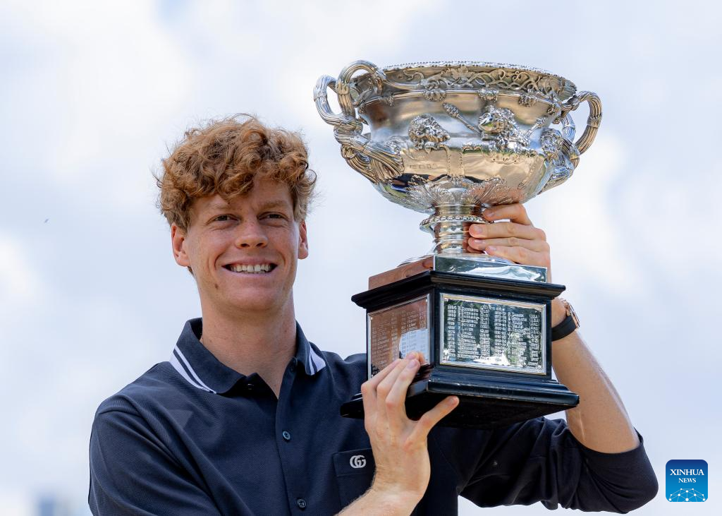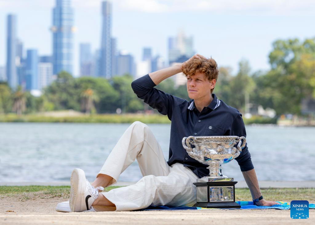 MELBOURNE, 27 enero, 2025 (Xinhua) -- Jannik Sinner, de Italia, posa con el trofeo durante la sesión fotográfica del ganador del torneo de tenis Abierto de Australia en el lago Albert Park, en Melbourne, Australia, el 27 de enero de 2025. (Xinhua/Chu Chen)