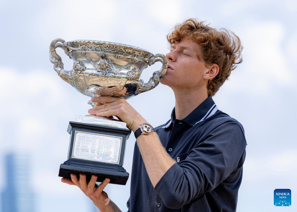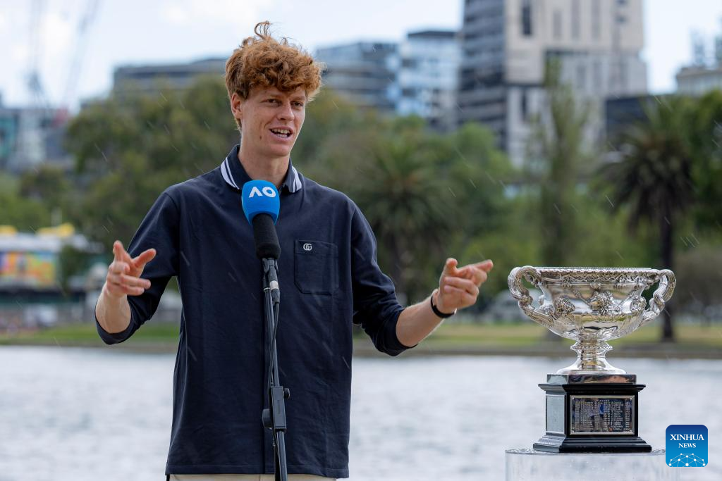 MELBOURNE, 27 enero, 2025 (Xinhua) -- Jannik Sinner, de Italia, habla durante la sesión fotográfica del ganador del torneo de tenis Abierto de Australia en el lago Albert Park, en Melbourne, Australia, el 27 de enero de 2025. (Xinhua/Chu Chen)