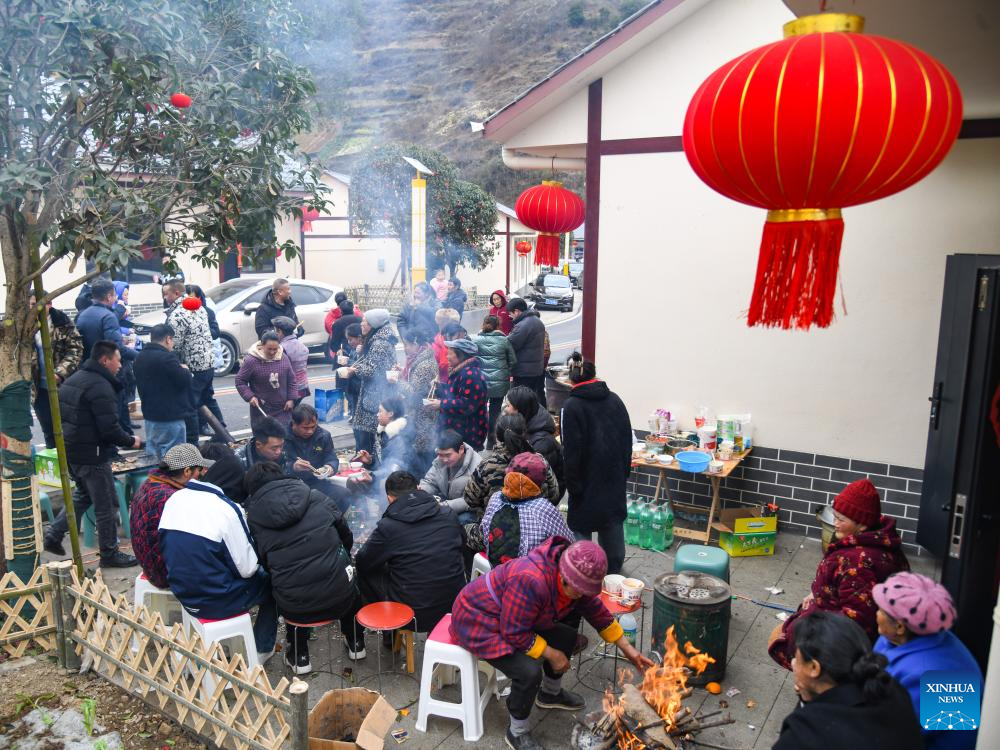 XINHUA, 28 enero, 2025 (Xinhua) -- Imagen del 25 de enero de 2025 de personas participando en un banquete de mudanza del aldeano Yang Fen, en la aldea de Xinhua, en el municipio Malie, en el distrito de Hanyuan, en la provincia de Sichuan, en el suroeste de China. La aldea Xinhua, ubicada en el distrito de Hanyuan de la ciudad de Ya'an, fue afectada por una inundación repentina de un río local causada por fuertes lluvias en julio de 2024. Actualmente, los residentes afectados se han mudado a nuevas viviendas con muebles y electrodomésticos en los sitios de reubicación. Y han decorado sus viviendas y se han preparado bien para celebrar la Fiesta de la Primavera. (Xinhua/Wang Xi)