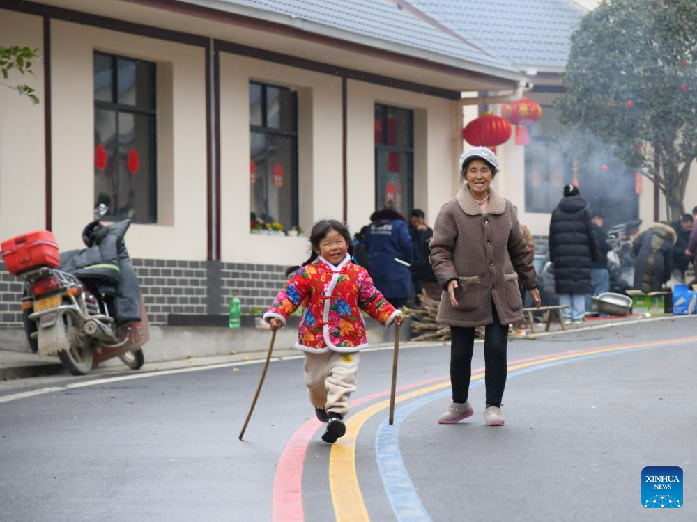 XINHUA, 28 enero, 2025 (Xinhua) -- Imagen del 25 de enero de 2025 de una niña corriendo, en la aldea de Xinhua, en el municipio Malie, en el distrito de Hanyuan, en la provincia de Sichuan, en el suroeste de China. La aldea Xinhua, ubicada en el distrito de Hanyuan de la ciudad de Ya'an, fue afectada por una inundación repentina de un río local causada por fuertes lluvias en julio de 2024. Actualmente, los residentes afectados se han mudado a nuevas viviendas con muebles y electrodomésticos en los sitios de reubicación. Y han decorado sus viviendas y se han preparado bien para celebrar la Fiesta de la Primavera. (Xinhua/Wang Xi)