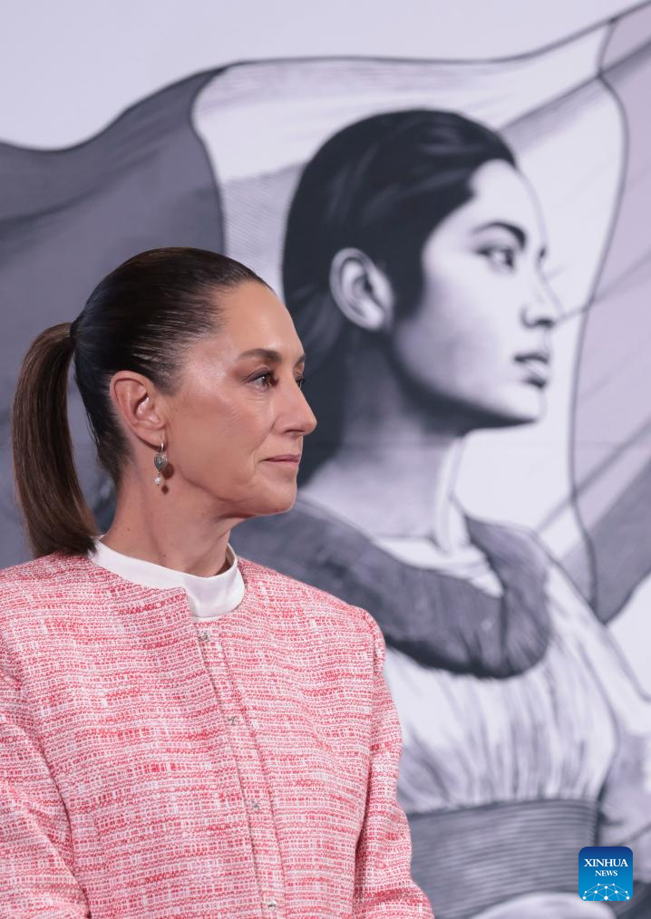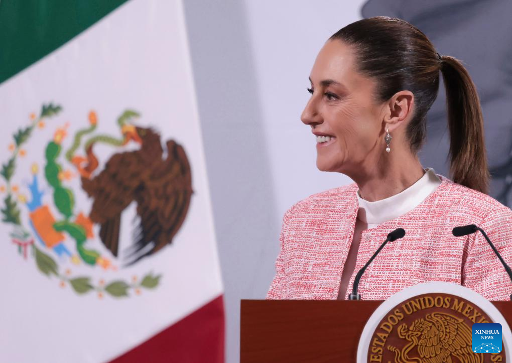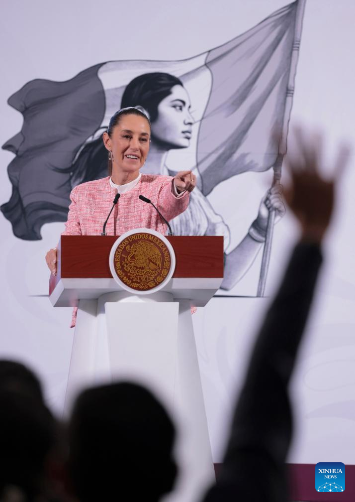 La presidenta mexicana, Claudia Sheinbaum, asiste a su conferencia de prensa matutina en el Palacio Nacional, en la Ciudad de México, capital de México, el 4 de febrero de 2025. Sheinbaum confirmó que inició el martes el despliegue de 10.000 elementos de la Guardia Nacional a lo largo de los 3.200 kilómetros de la frontera con Estados Unidos, como parte del acuerdo alcanzado la víspera con su homólogo estadounidense, Donald Trump, para combatir el tráfico de fentanilo y frenar la migración irregular. (Xinhua/Presidencia de México)