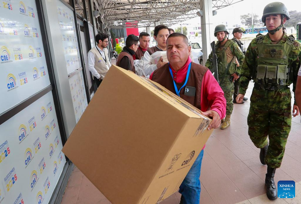 Un integrante del Consejo Nacional Electoral transporta una urna que contiene papeletas de votación para las personas privadas de la libertad, en Quito, capital de Ecuador, el 6 de febrero de 2025. Más de 13,7 millones de electores, dentro y fuera del país, están convocados a las urnas para elegir presidente y vicepresidente, así como 151 legisladores que integrarán la Asamblea Nacional y cinco representantes al Parlamento Andino. (Xinhua/Ricardo Landeta)