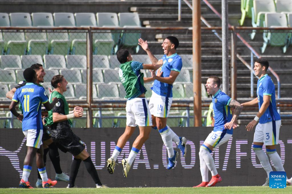 CARACAS, 7 febrero, 2025 (Xinhua) -- El jugador Iago Da Silva (3-d), de Brasil, festeja su anotación con sus compañeros durante el partido correspondiente a la segunda fecha de la fase final del torneo Sudamericano Sub-20 de la Confederación Sudamericana de Fútbol (Conmebol), ante Colombia, celebrado en el Estadio Olímpico de la Universidad Central de Venezuela, en Caracas, Venezuela, el 7 de febrero de 2025. (Xinhua/Marcos Salgado)