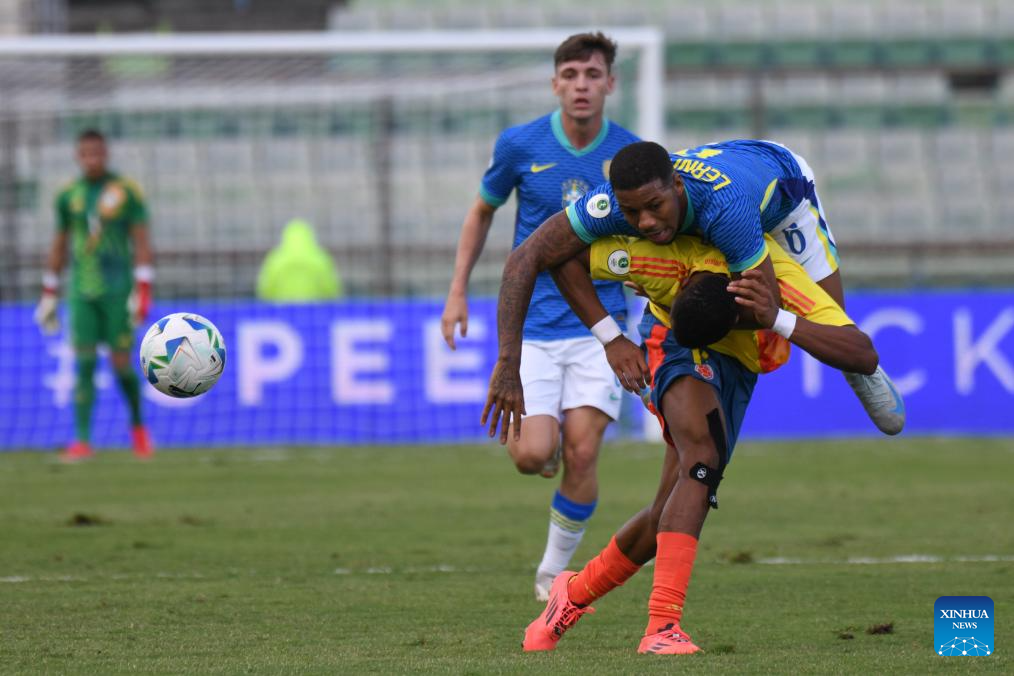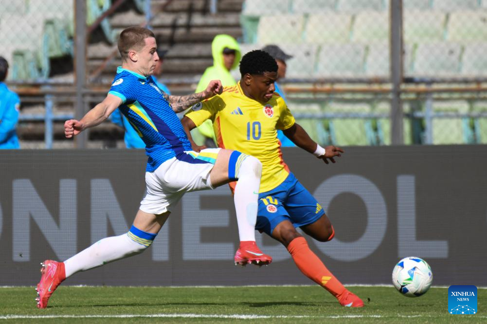 CARACAS, 7 febrero, 2025 (Xinhua) -- El jugador Oscar Perea (d), de Colombia, disputa el balón con Igor Schlemper (i), de Brasil, durante el partido correspondiente a la segunda fecha de la fase final del torneo Sudamericano Sub-20 de la Confederación Sudamericana de Fútbol (Conmebol), celebrado en el Estadio Olímpico de la Universidad Central de Venezuela, en Caracas, Venezuela, el 7 de febrero de 2025. (Xinhua/Marcos Salgado)