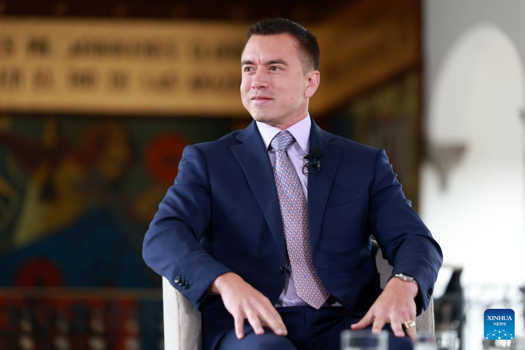 Imagen cedida por la Presidencia de Ecuador del presidente ecuatoriano y candidato a la reelección, Daniel Noboa, asistiendo a una entrevista con Radio Centro en el Palacio de Gobierno, en Quito, capital de Ecuador, el 11 de febrero de 2025. Noboa afirmó el martes que hubo "irregularidades" en las elecciones presidenciales del pasado domingo 9 de febrero en el país, cuyos resultados apuntan a una segunda vuelta con su rival política de izquierda, Luisa González, del movimiento Revolución Ciudadana. (Xinhua/Isaac Castillo/Presidencia de Ecuador)