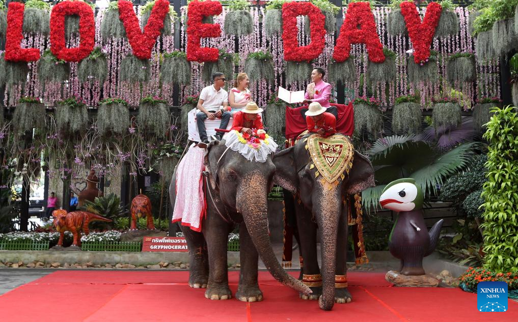PATTAYA, 14 febrero, 2025 (Xinhua) -- Una pareja monta un elefante durante una ceremonia de boda masiva en el Jardín Tropical Nong Nooch, en Pattaya, Tailandia, el 14 de febrero de 2025. Nueve parejas se casaron mientras montaban elefantes aquí el viernes en una ceremonia de boda masiva del Día de San Valentín. (Xinhua/Rachen Sageamsak)