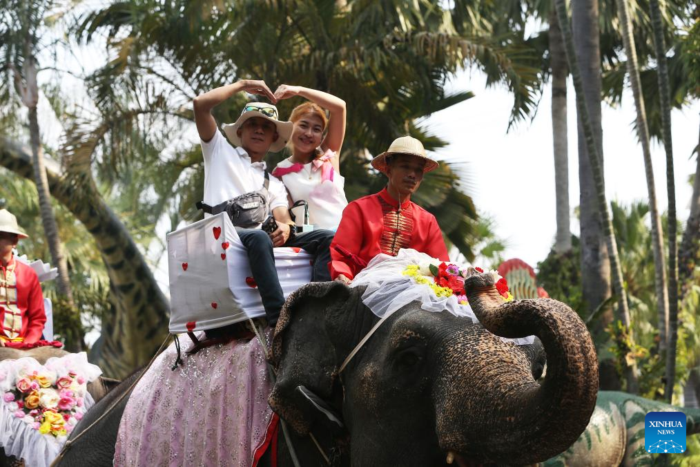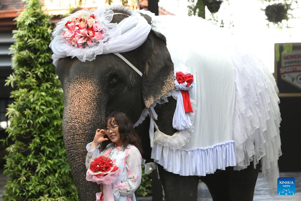 PATTAYA, 14 febrero, 2025 (Xinhua) -- Una turista posa para fotografías con un elefante durante una ceremonia de boda masiva en el Jardín Tropical Nong Nooch, en Pattaya, Tailandia, el 14 de febrero de 2025. Nueve parejas se casaron mientras montaban elefantes aquí el viernes en una ceremonia de boda masiva del Día de San Valentín. (Xinhua/Rachen Sageamsak)